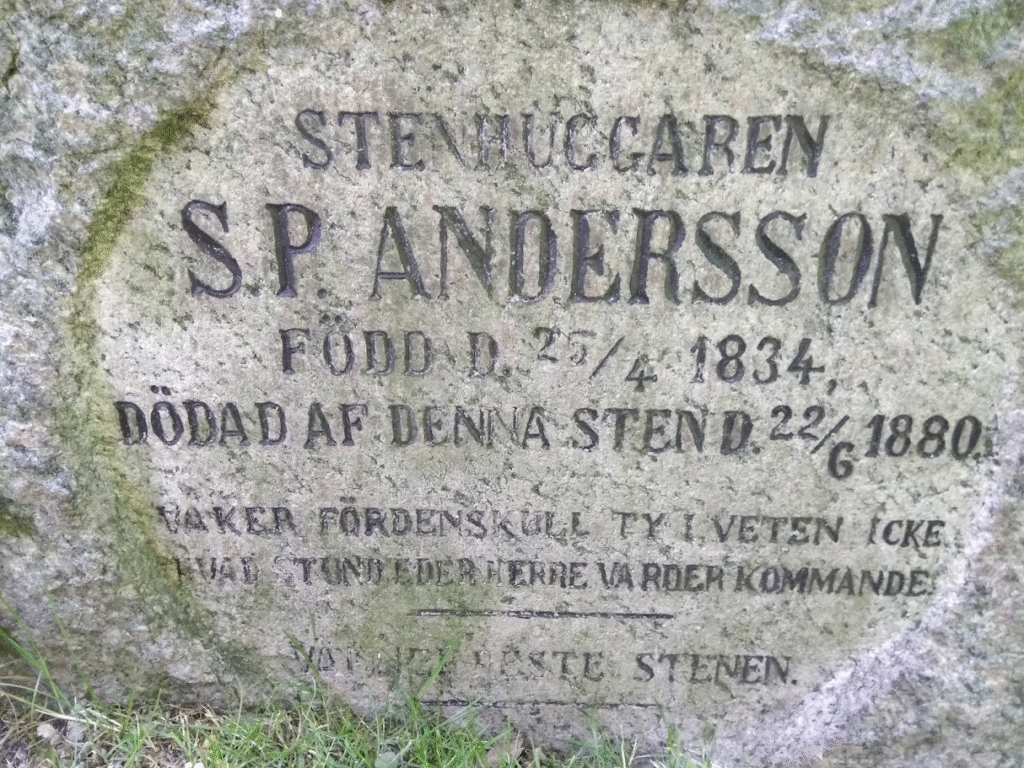 ”Stenhuggaren S.P. Andersson född d. 25/4 1834 dödad af denna sten d 22/6 1880 Vaker fördenskull ty i veten icke hvad stund eder herre varder kommande Vänner reste stenen.”Fascinerande. ”Dödad av denna sten”. Tänk. Jag gillar att vännerna reste stenen.